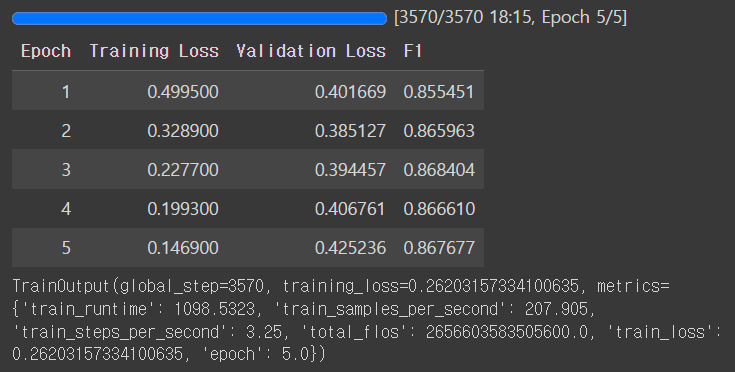 # metric_for_best_model: 최적의 모델을 결정할 때 사용할 메트릭을 지정, F1