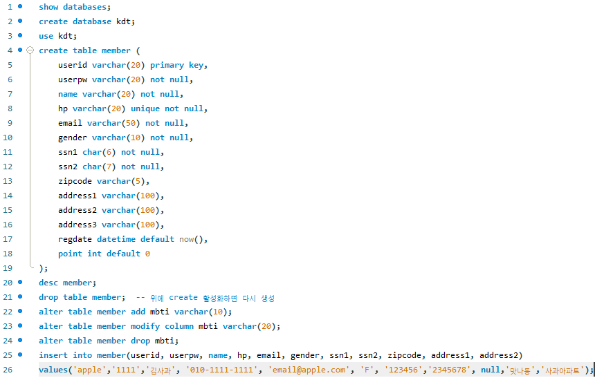 alter table 테이블명 modify column 컬럼명 데이터타입 제약조건; - 필드 삭제하기