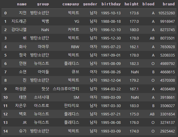 14 슈가 방탄소년단 빅히트 남자 1993-03-09 174.0 O 2925442