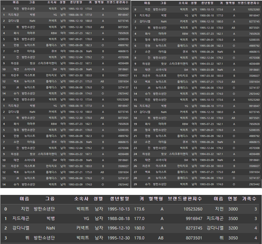 - merge() : 판다스에서 데이터프레임을 병합(merge)하는 데에 사용되는 함수로, SQL의 JOIN 연산과 유사한 동작을 합니다. how: 병합 방법 ('left', 'right', 'outer', 'inner' 중 하나) / on: 기준이 되는 열(컬럼)의 이름 또는 여러 열의 이름.