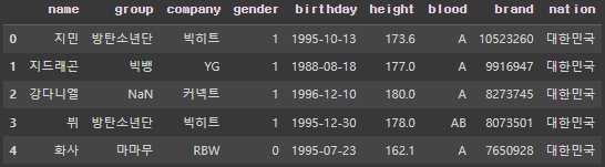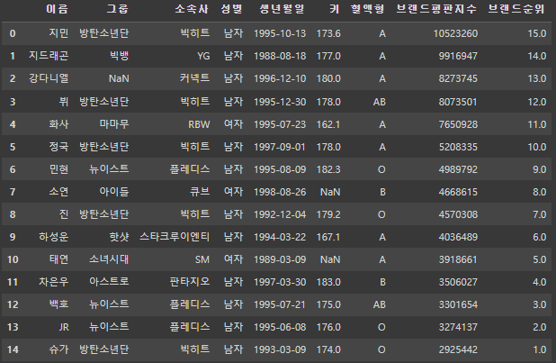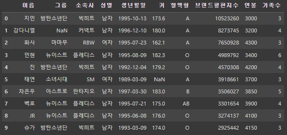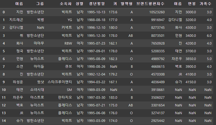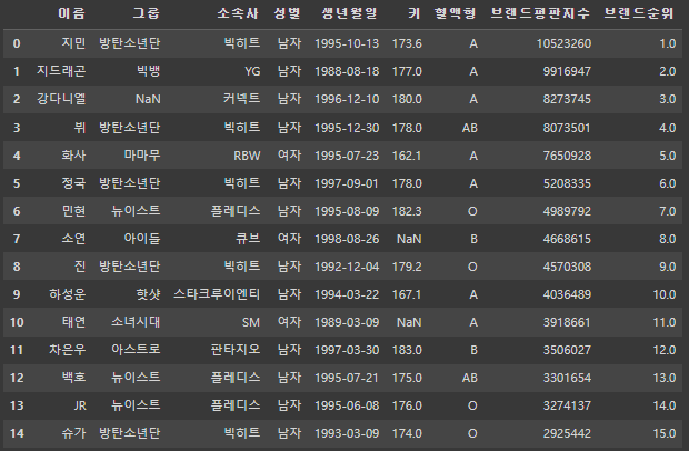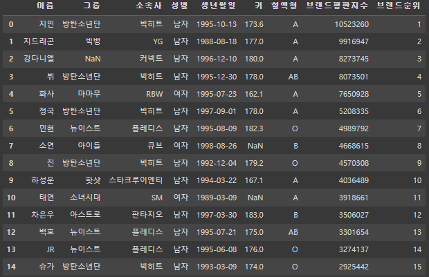Index(['이름', '그룹', '소속사', '성별', '생년월일', '혈액형'], dtype='object')