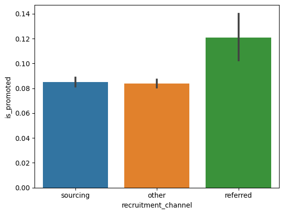 sns.barplot(x ='recruitment_channel', y = 'is_promoted', data = hr_df)